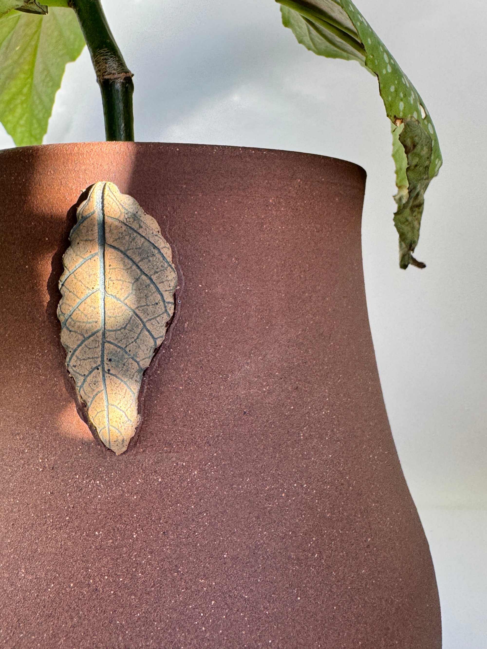Thrown on the potter's wheel, pressed with real leaves, and hand-sculpted